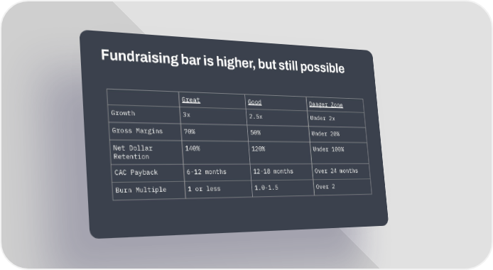 Fundraising bar is higher, but still possible Great Good Danger Zone Growth 3x 2.5x Under 2x Gross Margins 70% 50% Under 20% Net Dollar 140% 120% Under 100% Retention CAC Payback 6-12 months 12-18 months Over 24 months Burn Multiple 1 or less 1.0-1.5 Over 2