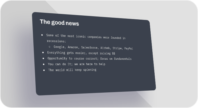 The good news ● Some of the most iconic companies were founded in recessions: ○ Google, Amazon, Salesforce, Airbnb, Stripe, PayPal ● Everything gets easier, except raising $$ ● Opportunity to course correct; focus on fundamentals ● You can do it; we are here to help ● The world will keep spinning