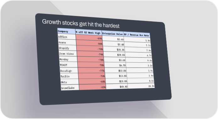 Growth stocks get hit the hardest Company % off 52 Week High Enterprise Value EV / Revenue Run Rate Affirm -89% $2.6B 1.8x Asana -86% $3.4B 7.7x Shopify -79% $38.3B 7.9x Zoom Video -79% $20.0B 4.7x Monday -78% $3.6B 9.4x TOAST -78% $6.5B 3.2x DocuSign -77% $13.8B 5.9x Twilio -76% $13.8B 3.9x Okta -68% $13.0B 8.5x Snowflake -65% $40.4B 26.3x