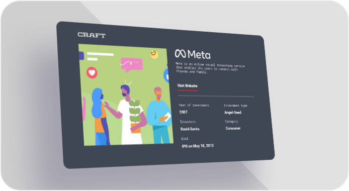 Meta is an online social networking service that enables its users to connect with friends and family. Visit Website Year of investment Investment type 2007 Angel-Seed Investors Category David Sacks Consumer Exit IPO on May 18, 2012