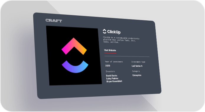 ClickUp is a customizable productivity platform that unifies Tasks, Docs, Goals, and Chat. Visit Website Year of investment Investment type 2020 Led Series A Investors Category David Sacks Enterprise Lainy Painter Bryan Rosenblatt