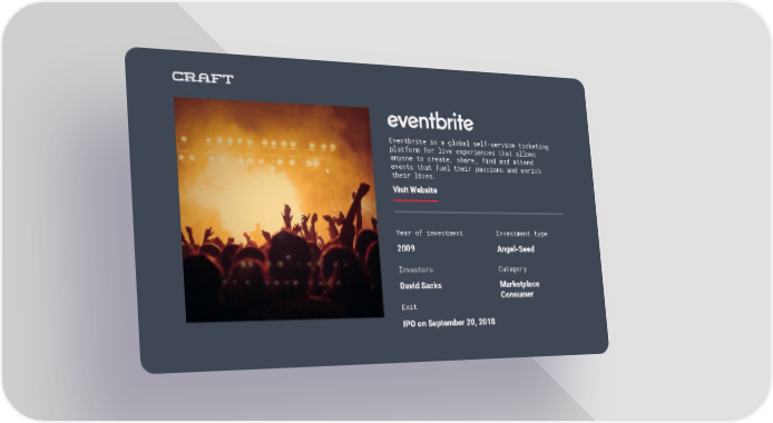 Eventbrite is a global self-service ticketing platform for live experiences that allows anyone to create, share, find and attend events that fuel their passions and enrich their lives. Visit Website Year of investment Investment type 2009 Angel-Seed Investors Category David Sacks Marketplace Consumer Exit IPO on September 20, 2018