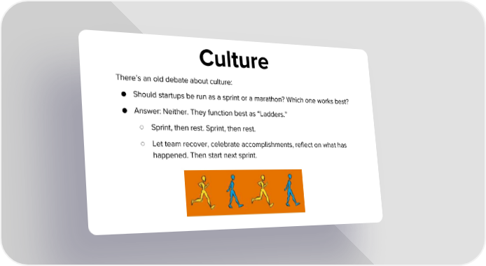 Culture There’s an old debate about culture: ● Should startups be run as a sprint or a marathon? Which one works best? ● Answer: Neither. They function best as “Ladders.” ○ Sprint, then rest. Sprint, then rest. ○ Let team recover, celebrate accomplishments, reflect on what has happened. Then start next sprint.