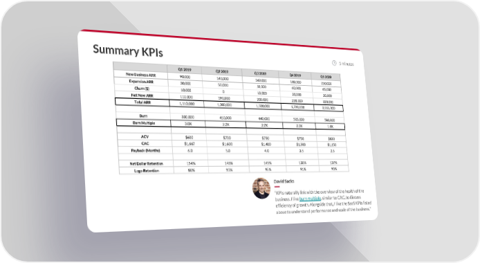 Summary KPIs 5 minutes Q1 2019 Q2 2019 Q3 2019 Q4 2019 Q1 2020 New Business ARR 90,000 140,000 160,000 180,000 250,000 Expansion ARR 30,000 50,000 50,000 60,000 85,000 Churn ($) 10,000 0 10,000 20,000 20,000 Net New ARR 110,000 190,000 200,000 220,000 320,000 Total ARR 1,110,000 1,300,000 1,500,000 1,720,000 2,355,000 Burn 330,000 410,000 440,000 505,000 580,000 Burn Multiple 3.0X 2.2X 2.2X 2.3X 1.8X ACV $600 $700 $730 $750 $833 CAC $1,667 $1,600 $1,400 $1,300 $1,150 Payback (Months) 6.0 5.0 4.0 3.5 2.5 Net Dollar Retention 154% 145% 145% 130% 137% Logo Retention 88% 95% 95% 91% 90% David Sacks “KPIs naturally link with the overview of the health of the business. I like burn multiple, similar to CAC, to discuss efficiency of growth. Alongside that, I like the SaaS KPIs listed above to understand performance and scale of the business.”