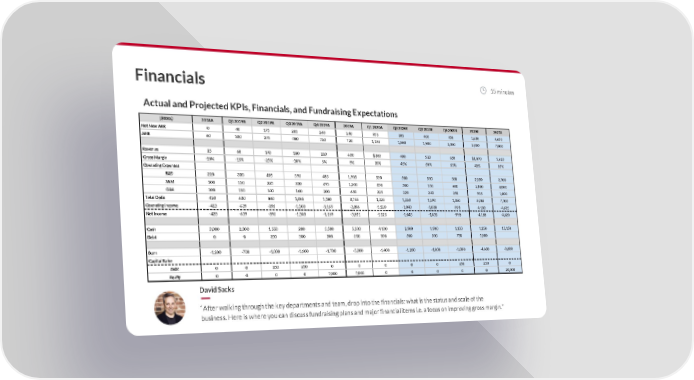 Financials 15 minutes Actual and Projected KPIs, Financials, and Fundraising Expectations ($000s) 2018A Q1 2019A Q2 2019A Q3 2019A Q4 2019A 2019A Q1 2020A Q2 2020E Q3 2020E Q4 2020E 2020E 2021E Net New ARR 0 40 175 205 240 240 955 305 400 450 1,630 4,650 ARR 60 100 275 480 720 720 1,195 1,500 1,900 2,350 2,350 7,000 Revenue 25 60 140 180 220 600 $300 400 520 650 $1,870 5,610 Gross Margin -10% -15% -25% -10% 5% -9% 35% 45% 50% 55% 48% 55% Operating Expenses R&D 220 330 495 595 485 1,905 550 500 500 500 2,050 2,700 S&M 100 150 225 330 495 1,200 450 500 550 600 2,100 4,000 G&A 100 150 140 160 200 650 225 220 240 250 935 1,000 Total OpEx 420 630 860 1,085 1,180 3,755 1,225 1,220 1,290 1,350 5,085 7,700 Operating Income -423 -639 -895 -1,103 -1,169 -3,806 -1,120 -1,040 -1,030 -993 -4,183 -4,615 Net Income -428 -639 -895 -1,103 -1,169 -3,811 -1,125 -1,045 -1,035 -998 -4,188 -4,620 Cash 3,000 2,300 1,550 200 5,500 5,500 4,100 2,900 1,900 1,150 1,150 13,150 Debt 0 0 250 500 500 500 500 500 500 750 1,000 Burn -1,200 -700 -1,000 -1,600 -1,700 -5,000 -1,400 -1,200 -1,000 -1,000 -4,600 -8,000 Capital Raise Debt 0 0 250 250 0 0 0 0 0 250 250 0 Equity 0 0 0 0 7,000 7,000 0 0 0 0 0 20,000 David Sacks “After walking through the key departments and team, drop into the financials: what is the status and scale of the business. Here is where you can discuss fundraising plans and major financial items i.e. a focus on improving gross margin.”
