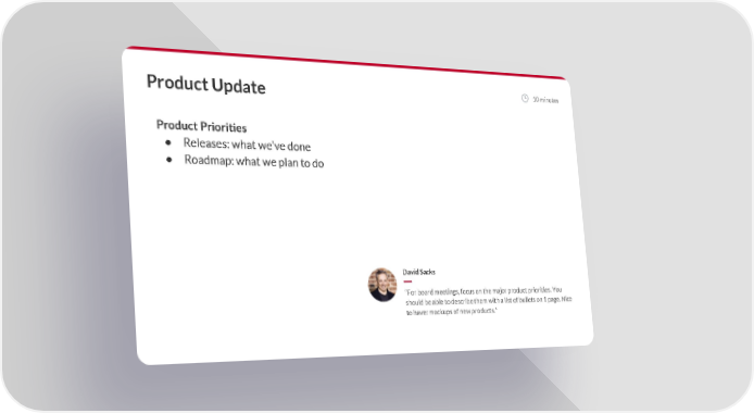 Product Update 10 minutes Product Priorities ● Releases: what we’ve done ● Roadmap: what we plan to do David Sacks “For board meetings, focus on the major product priorities. You should be able to describe them with a list of bullets on 1 page. Nice to have: mockups of new products.”