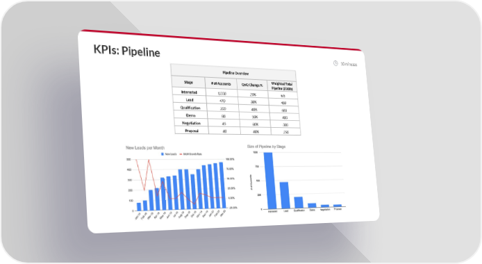 KPIs: Pipeline 10 minutes Pipeline Overview Stage # of Accounts QoQ Change % Weighted Total Pipeline ($000s) Interested 1,000 25% n/a Lead 470 30% 400 Qualification 200 40% 600 Demo 80 50% 400 Negotiation 45 60% 300 Proposal 40 40% 250