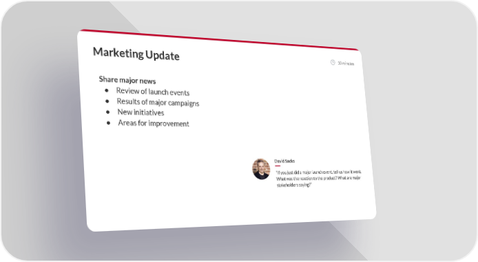 Marketing Update 10 minutes Share major news ● Review of launch events ● Results of major campaigns ● New initiatives ● Areas for improvement David Sacks “If you just did a major launch event, tell us how it went. What was the reaction to the product? What are major stakeholders saying?”