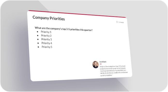 Company Priorities 5 minutes What are the company’s top 3-5 priorities this quarter? ● Priority 1 ● Priority 2 ● Priority 3 ● Priority 4 ● Priority 5 David Sacks “In light of the strategic learnings, CEOs should constantly be prioritizing and reprioritizing the most important initiatives. If you do OKRs, then this list of priorities can provide a first draft of your quarterly objectives.”