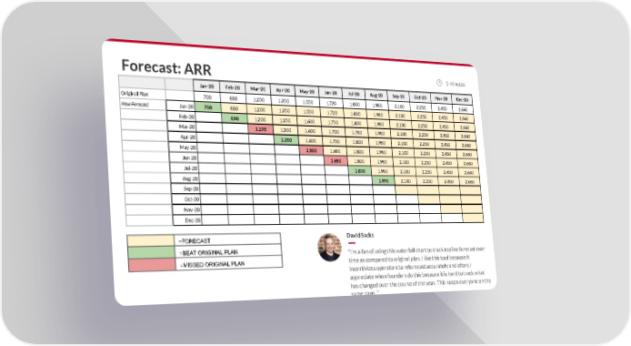 Forecast: ARR 5 minutes Jan-20 Feb-20 Mar-20 Apr-20 May-20 Jun-20 Jul-20 Aug-20 Sep-20 Oct-20 Nov-20 Dec-20 Original Plan 700 880 1,200 1,350 1,550 1720 1,800 1,980 2,100 2,250 2,450 2,660 New Forecast Jan-20 700 880 1,200 1,350 1,550 1,720 1,800 1,980 2,100 2,250 2,450 2,660 Feb-20 890 1,200 1,350 1,600 1,750 1,800 1,980 2,100 2,250 2,450 2,660 Mar-20 1,195 1,350 1,600 1,700 1,780 1,980 2,100 2,250 2,450 2,660 Apr-20 1,350 1,600 1,700 1,800 1,980 2,100 2,250 2,450 2,660 May-20 1,500 1,680 1,800 1,980 2,100 2,250 2,450 2,660 Jun-20 1,650 1,800 1,980 2,100 2,250 2,450 2,660 Jul-20 1,830 1,980 2,100 2,250 2,450 2,660 Aug-20 1,990 2,100 2,250 2,450 2,660 Sep-20 Oct-20 Nov-20 Dec-20 =FORECAST David Sacks =BEAT ORIGINAL PLAN āIām a fan of using this waterfall chart to track topline forecast over =MISSED ORIGINAL PLAN time as compared to original plan. I like this tool because it incentivizes operators to reforecast accurately and often; I appreciate when founders do this because it is hard to track what has changed over the course of the year. This keeps everyone on the same page. ā